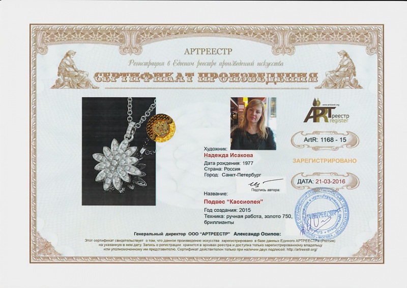 Online система регистрации арт-объектов artreestr / Сертификаты произведений членов «АРТ реестра» / Исакова Надежда Владимировна / Подвес "Кассиопея"