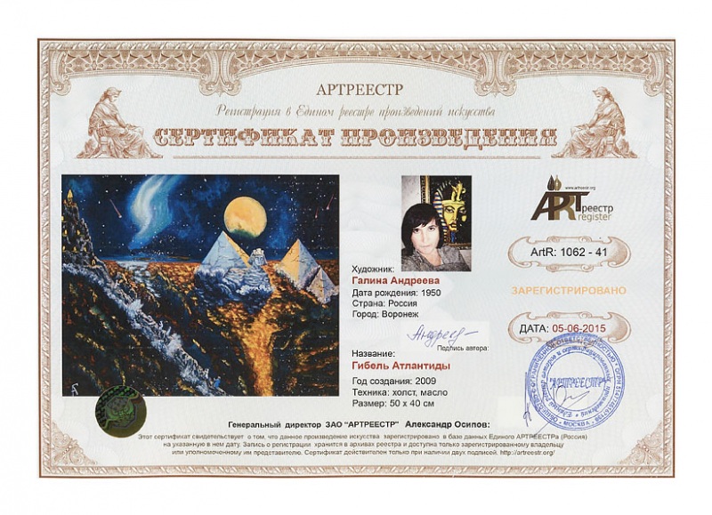 Online система регистрации арт-объектов artreestr / Сертификаты произведений членов «АРТ реестра» / Андреева Галина Викторовна / Гибель Атлантиды