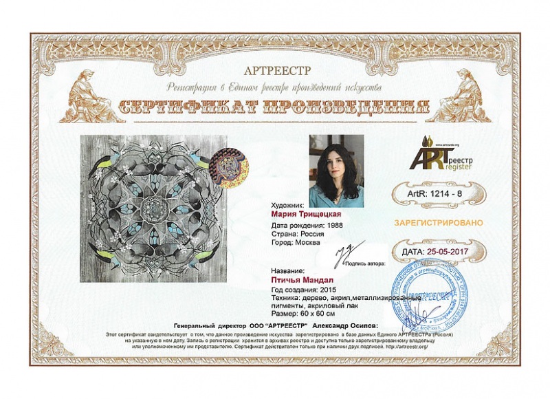 Online система регистрации арт-объектов artreestr / Сертификаты произведений членов «АРТ реестра» / Трищецкая Мария Юрьевна / Птичья Мандала
