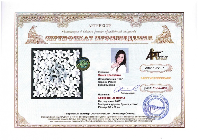Online система регистрации арт-объектов artreestr / Сертификаты произведений членов «АРТ реестра» / Кравченко Ольга Валентиновна / Серебряные цветы