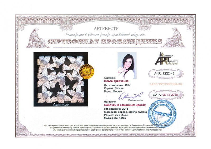 Online система регистрации арт-объектов artreestr / Сертификаты произведений членов «АРТ реестра» / Кравченко Ольга Валентиновна / Бабочки в каменных цветах