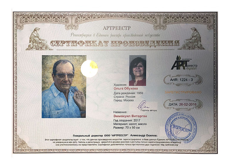 Online система регистрации арт-объектов artreestr / Сертификаты произведений членов «АРТ реестра» / Обухова Ольга Ивановна / Эммануил Виторган