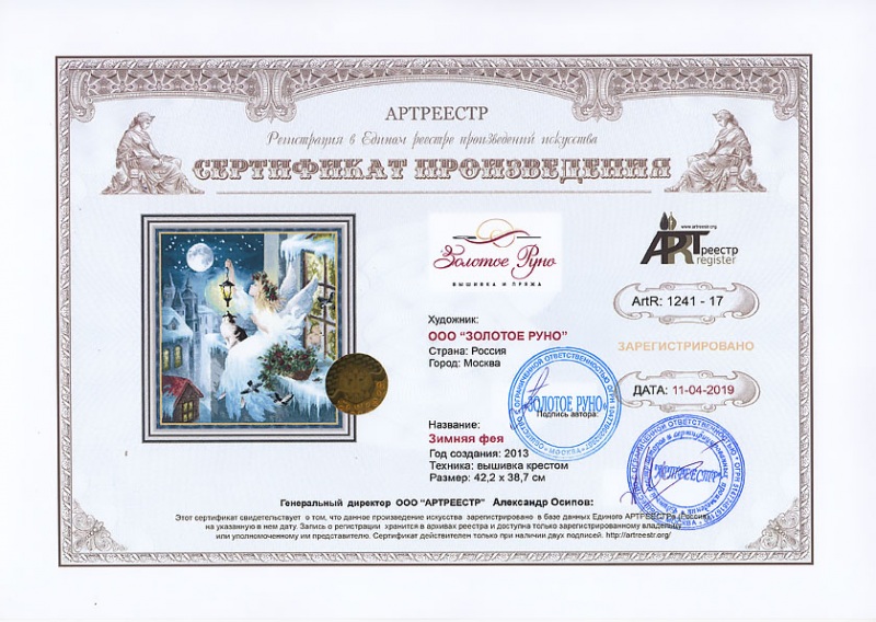 Online система регистрации арт-объектов artreestr / Сертификаты произведений членов «АРТ реестра» / ООО "ЗОЛОТОЕ РУНО" / Зимняя фея