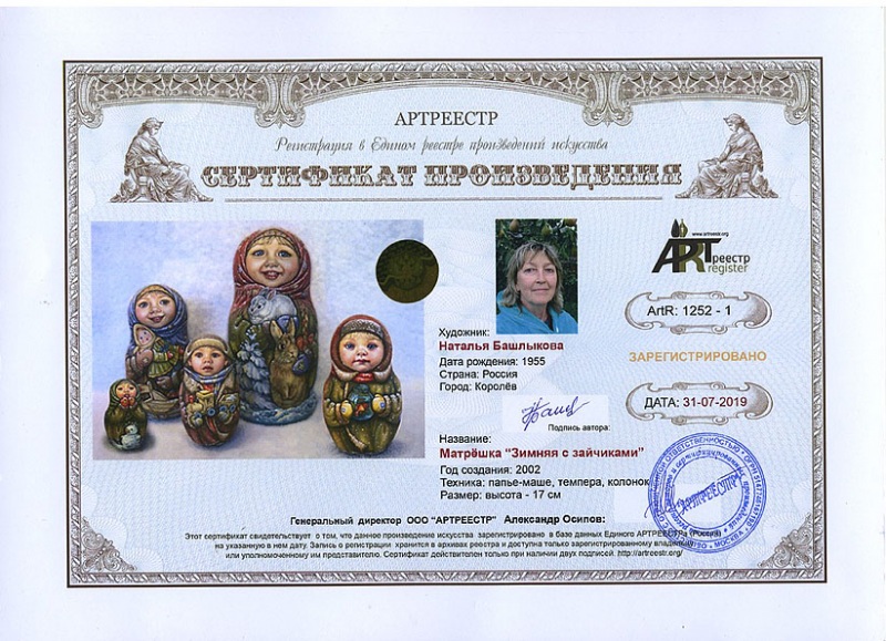 Online система регистрации арт-объектов artreestr / Сертификаты произведений членов «АРТ реестра» / Башлыкова Наталья / Матрешка "Зимняя с зайчиками"