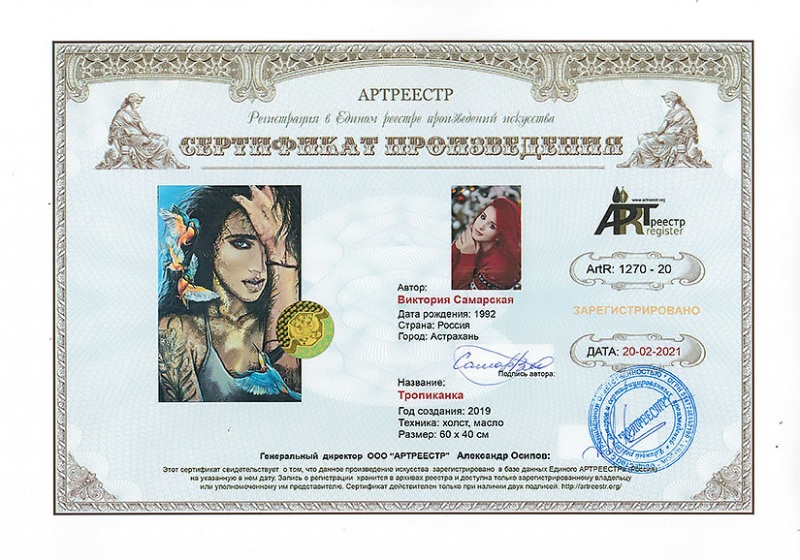 Online система регистрации арт-объектов artreestr / Сертификаты произведений членов «АРТ реестра» / Самарская Виктория Валерьевна / Тропиканка
