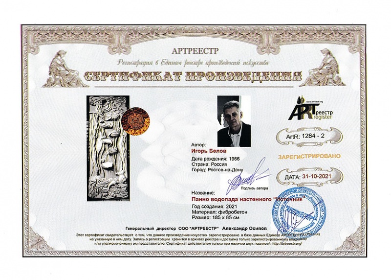 0 0 0 0 0   Online система регистрации арт-объектов artreestr / Сертификаты произведений членов «АРТ реестра» / Белов Игорь Геннадьевич / Панно водопада настенного "Источник"