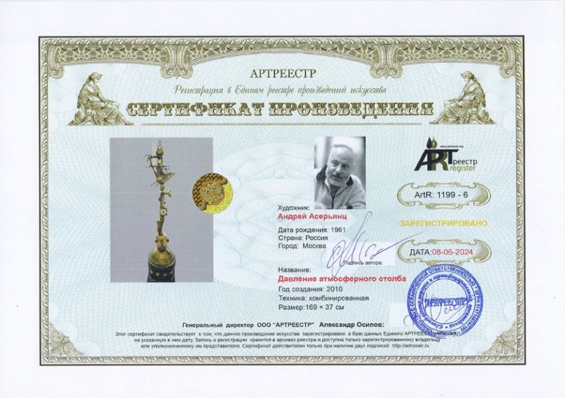 Online система регистрации арт-объектов artreestr / Сертификаты произведений членов «АРТ реестра» / Асерьянц Андрей Викторович / Давление атмосферного столба