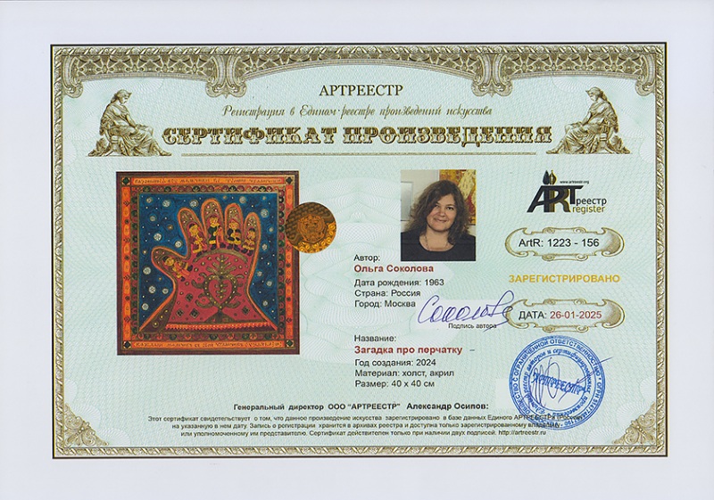 Online система регистрации арт-объектов artreestr / Сертификаты произведений членов «АРТ реестра» / Соколова Ольга Львовна / Загадка про перчатку