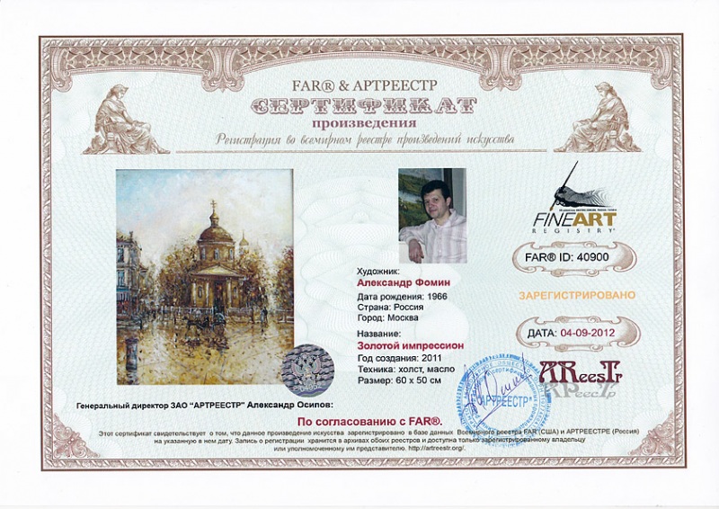 Online система регистрации арт-объектов artreestr / Сертификаты произведений членов «АРТ реестра» / Фомин Александр Викторович / Золотой импрессион