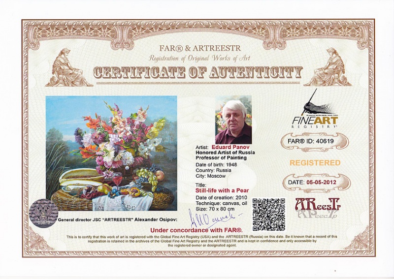 Online система регистрации арт-объектов artreestr / Сертификаты произведений членов «АРТ реестра» / Панов Эдуард Парфирьевич / Натюрморт с грушей