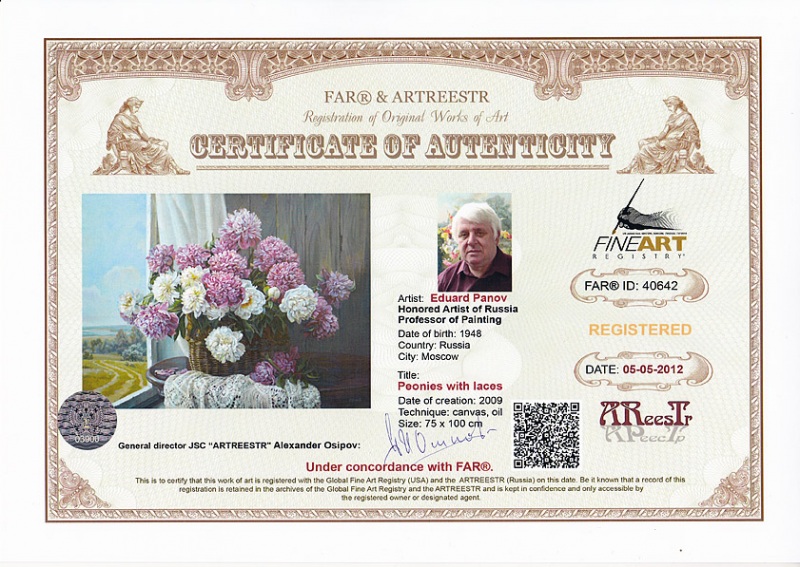 Online система регистрации арт-объектов artreestr / Сертификаты произведений членов «АРТ реестра» / Панов Эдуард Парфирьевич / Пионы с кружевами