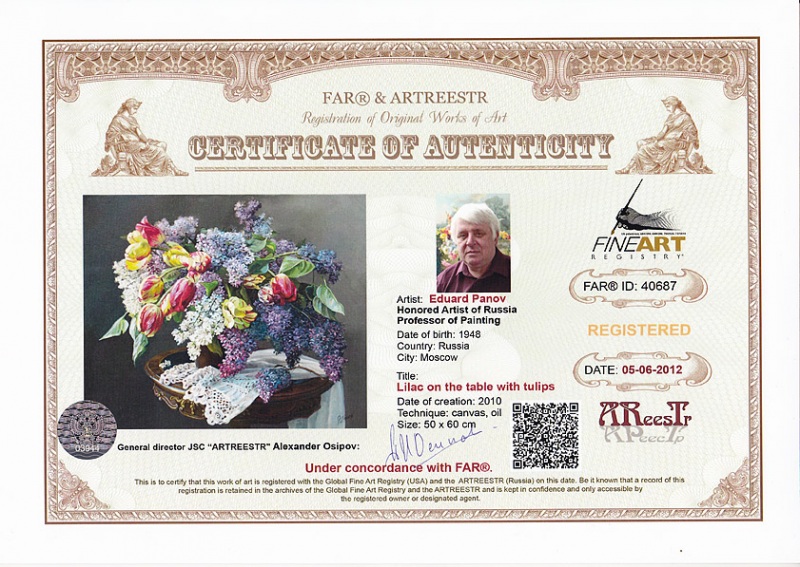 Online система регистрации арт-объектов artreestr / Сертификаты произведений членов «АРТ реестра» / Панов Эдуард Парфирьевич / Сирень с тюльпанами на столе