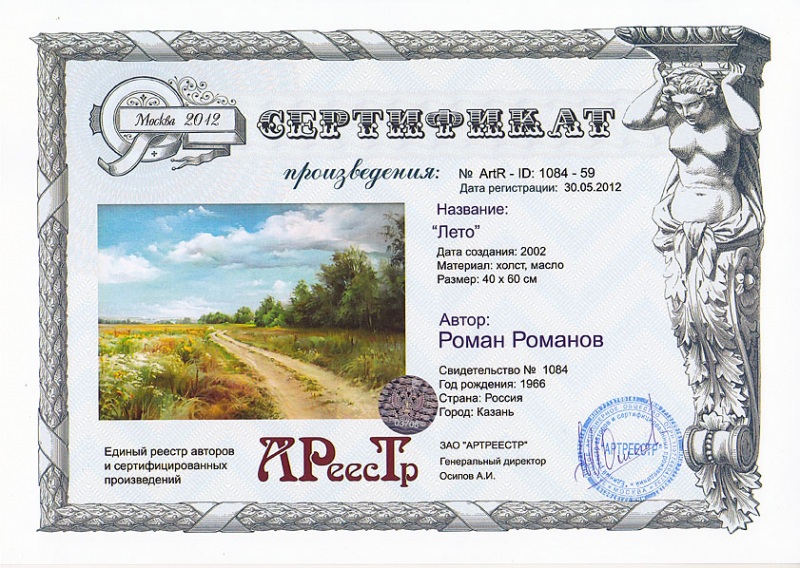 Online система регистрации арт-объектов artreestr / Сертификаты произведений членов «АРТ реестра» / Романов Роман Геннадьевич / Лето