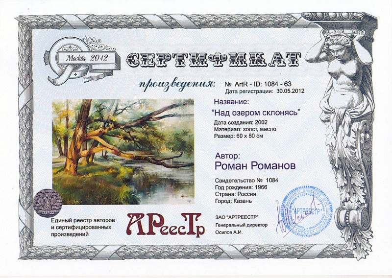 Online система регистрации арт-объектов artreestr / Сертификаты произведений членов «АРТ реестра» / Романов Роман Геннадьевич / Над озером склонясь