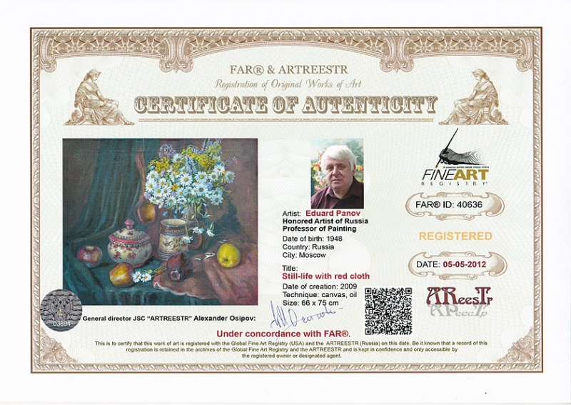 Online система регистрации арт-объектов artreestr / Сертификаты произведений членов «АРТ реестра» / Панов Эдуард Парфирьевич / Натюрморт с красной тканью